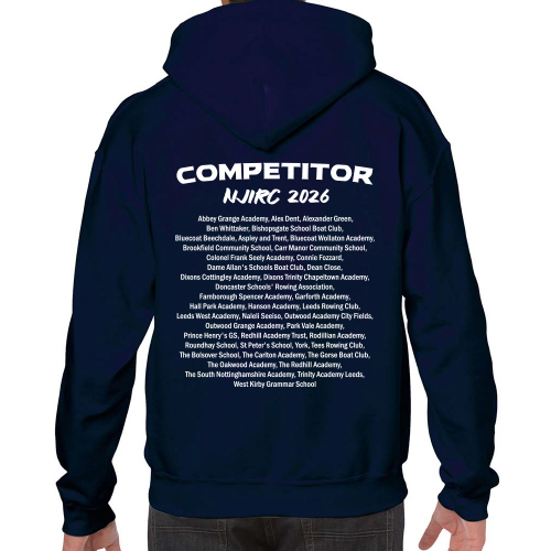 Navy hoody printed with NJIRC 2024 design to front and all competing clubs, schools and associations to back.