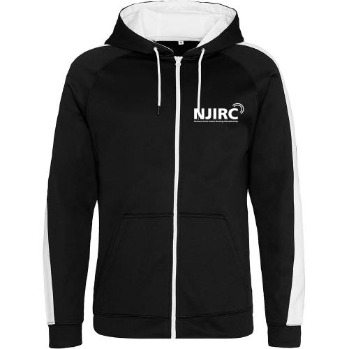 Black performance zip hoody with contrast white piping to sleeves. NJIRC logo embroidered to front left chest and GREAT BRITAIN printed to back. Product features drawstring chord to hood and front pouch pockets.